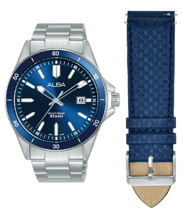 A 42.5mm stainless-steel watch with a 10.83mm case, featuring a blue dial and date display. Comes with a 22mm stainless steel wrap bracelet and an additional blue PU strap with quick-release spring bars, mineral crystal glass, and 10 bar water resistance for versatile, everyday wear.