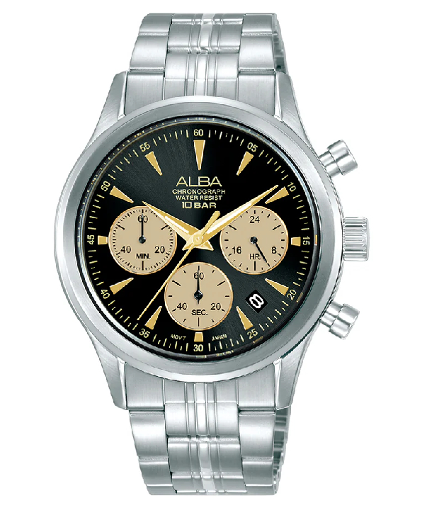 A 39mm stainless-steel watch with a 10.78mm case, featuring a black and beige dial with date, 12/24-hour indication, and a 60-minute chronograph accurate to 1 second with split time. Fitted with a 20mm stainless steel wrap bracelet, mineral crystal glass, and 10 bar water resistance for precise, everyday performance.