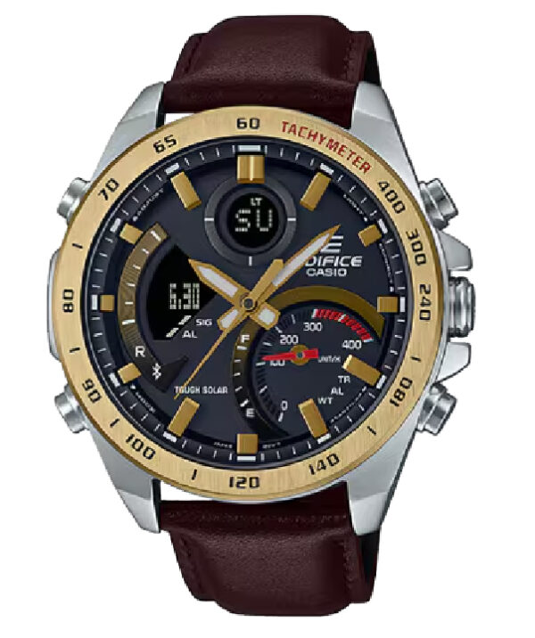 Smartphone Link | A digital/analog combination model from the “EDIFICE” smartphone link series. A multi-function model that displays various forms of information in an easy-to-understand way via an LCD in addition to the needle pointer hand. Displays the time with split second accuracy by linking to smartphones via Bluetooth, and is equipped with world time, which allows wearers to easily choose from approximately 300 cities. The large inner dial on the 4 o’clock side is a speed indicator. When measuring lap times, a sign indicating average speed is displayed based on set distances. Equipped with a fully automatic LED light that illuminates the dial and liquid crystal display with a simple tilt of the wrist to ensure visibility at night. Treating the bezel with a scratch resistant gold ion plate and using a genuine leather band creates a sporty yet traditional design.