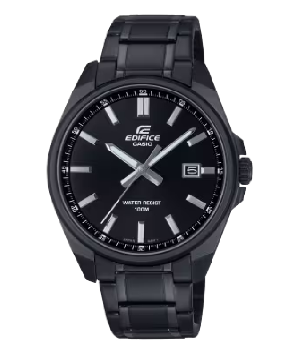 Slip on a contemporary classic — the simple sophistication of an analog design focused on the hour, minute, and seconds hands. Solid, sharp index marks add to the sporty, yet classic look, and the black ion-plated case and band make the statement a bold one. And, as with every EDIFICE, this timepiece delivers 100-meter water resistance.