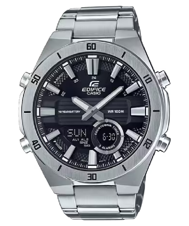 10-year Battery Life | A digital/analog combination model equipped with a long-life battery. A multi-functional model that displays not only a calendar but also world time, a 1/100 second stopwatch, and a countdown timer, etc. on an LCD screen. An extra-thick index design and three-dimensional dial produce a sporty design, while the hairline finish flat bezel creates a high-quality effect.Case size (L? W? H) 52 ? 47.6 ? 14.2 mm