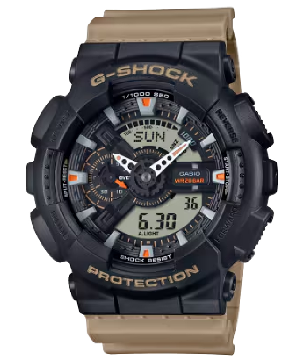 Utilitarian practicality, savvy style — all with G-SHOCK functionality and toughness. Pairing a black watch face with a band in beige or olive green, the two-tone utility color line evokes the functional look of a great piece of kit. Choose from five base models: the DW-6900 with iconic triple graph or the GA-700 with large case, both of which feature a metal front button with anti-slip finish; or the large-case designs of the GX-56, GA-100, and GA-110.