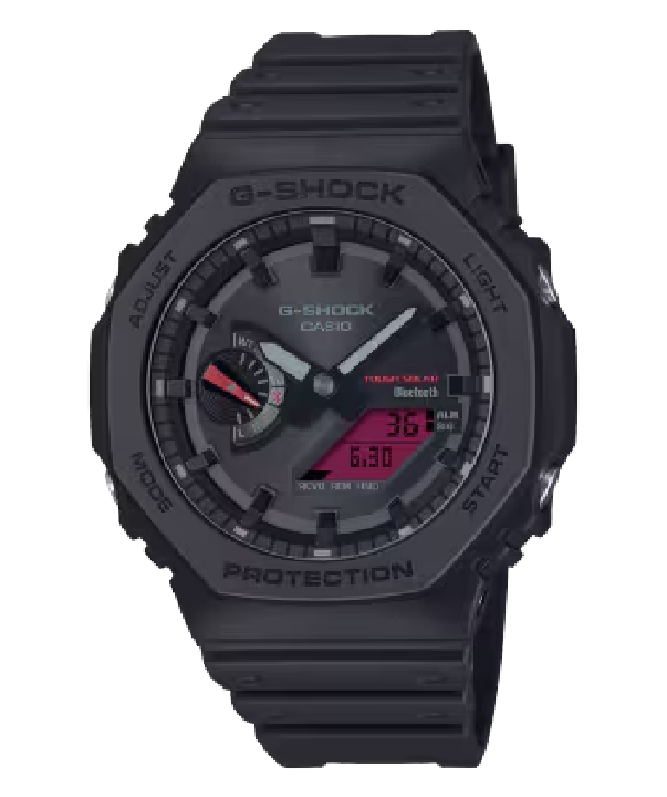 Go bold, tough, and intense, with the G-SHOCK black and red collection. The vibrant, high saturation red of the LCD really pops against the black bezel, band, and dial, not only enhancing visibility but also pushing the envelope of daring design. Activate the backlight to light up the digital display for even better visibility. Make a unique statement in all black, with a touch of bold red.