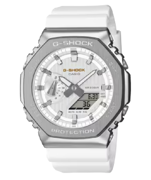 Stargaze to your heart’s content with 2025 limited-edition G-SHOCK timepieces inspired by the magic of starry skies and the splendor and wonder of the moment you catch sight of a falling star. Two pair-perfect sizes from the popular digital-analog 2100 line — the GM-2110SH and GM-S2110SH — feature a dial inspired by the magic of starry skies with metal elements that add shine and texture, and a hairline- and matte-finished bezel and indexes that project poised sophistication. The gold-colored G-SHOCK logo on the dial shines like a star against subtle stripes evoking stardust gently drifting across the sky. Choose navy blue for the dark night sky, or white for a magical shooting star. These timepieces make a wonderfully thoughtful holiday gift for your very special someone or an exciting addition to your own watch collection. Note: Key resin components used in the band are made with bio-based resin. Produced using renewable organic resources, this material is expected to help reduce environmental impact.