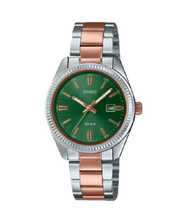 The Casio LTP-1302PRG-3AVEF is a classic women’s analog watch from the Casio Collection, featuring a vibrant emerald green sunray dial and a bicolor silver and rose-gold stainless steel bracelet. It combines a sophisticated fluted bezel with practical daily features like a date display and water resistance.