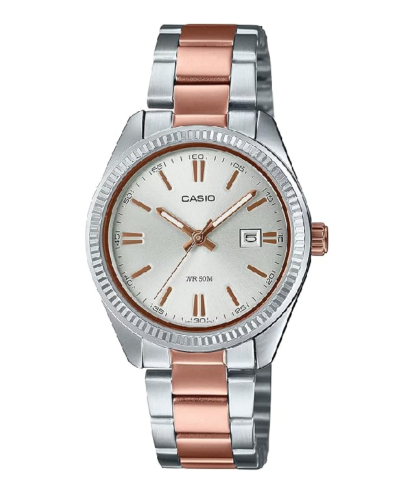 The Casio Collection Women’s Watch (LTP-1302PRG-7AVEF) is an elegant analog timepiece designed for versatility, featuring a distinctive two-tone rose gold and silver aesthetic. It is known for its classic round case and durable construction, making it suitable for both professional and casual wear.