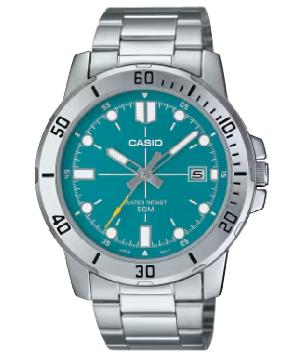 Make a stylishly cool statement with a deliciously detailed finish and a gorgeous, colorful dial. The thick bezel adds a sporty touch to a metal analog watch designed around the classic hour, minute, and seconds hand look. Water resistance up to 50 meters frees you from worry when washing up or working with water.