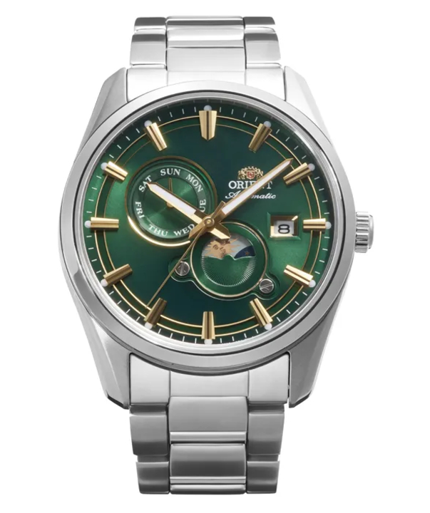 The Orient Stretto Sun & Moon RA-AK0314E30B is a sophisticated blend of classic complication and modern executive style. Featuring a striking deep green sunray dial, this timepiece stands out with its unique Sun & Moon (AM/PM) indicator at the 4 o’clock position and a dedicated day-of-the-week sub-dial. The 41.5mm stainless steel case offers a contemporary presence on the wrist, protected by a scratch-resistant sapphire crystal. Powered by a reliable in-house Japanese automatic movement, it is a versatile choice for both formal attire and daily business wear.