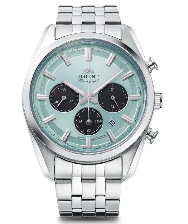 The Orient Contemporary RN-TX0304L (also known as the “Stretto”) is a sophisticated solar-powered chronograph that blends vintage “panda” dial aesthetics with modern, low-maintenance technology. It features a striking light blue sunray dial, a scratch-resistant sapphire crystal, and a 1/5-second chronograph hand that mimics the sweeping motion of a mechanical watch.