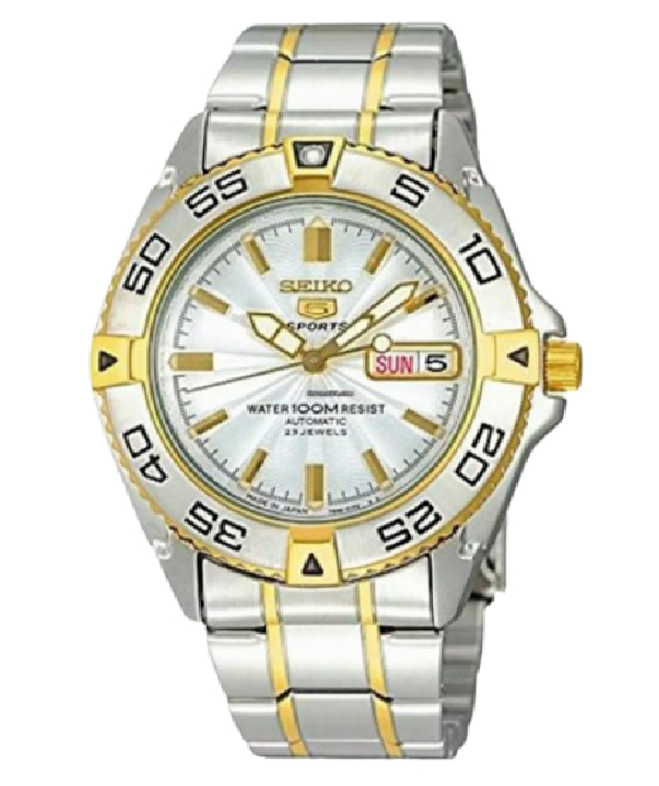 Made In Japan, Stainless Steel Case, Two Tone Stainless Steel Bracelet, Automatic Movement, Caliber: 7S36, 23 Jewels, Hardlex Crystal, White Dial, Analog Display, Luminous Hands And Markers, Day And Date Display, Uni Directional Rotating Bezel, Pull/Push Crown, See Through Case Back, Deployment Clasp, 100M Water Resistance, Approximate Case Diameter: 39mm, Approximate Case Thickness: 12mm