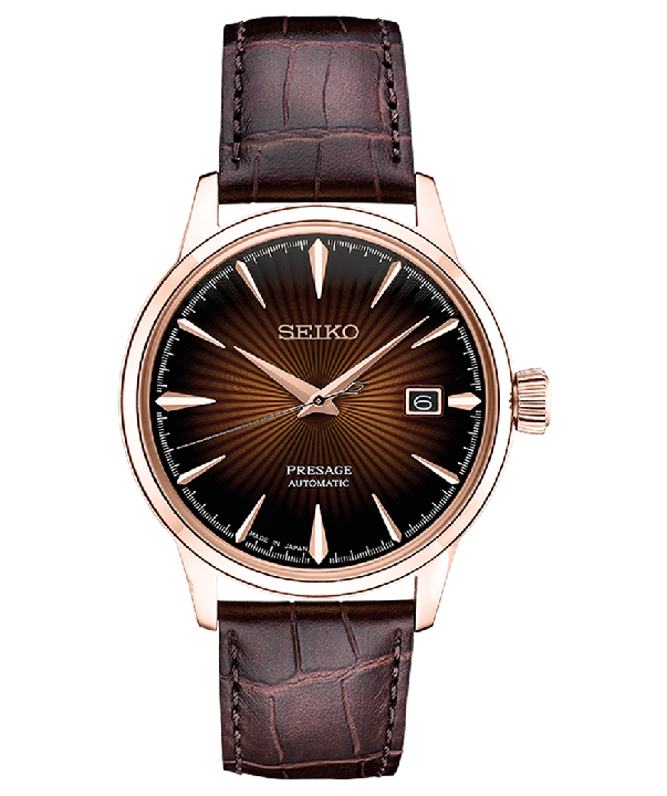 Seiko Presage Automatic. This refine men’s watch is designed with a rose gold-finish stainless steel case and brown leather strap. The dial features a burgundy deep, pressed pattern whose shimmering beauty is enhanced by seven layers of gloss finish and the clarity of the box-shaped crystals. The hands are delicately curved by skilled craftsmen and women to give the watch case a slimmer profile. When turning the uniquely shaped crown, you can feel the strong torque of the winding mechanism. Automatic movement allows self and automatic winding capabilities and features 21,600 vibrations per hour, with a power reserve of approximately 41 hours, as well as 23 jewels. 50M Water Resistant