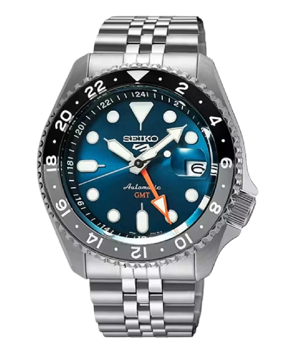 A sporty automatic GMT watch with a bold Velocity Blue dial, inspired by vintage racing heritage. Ideal for tracking multiple time zones with reliable Seiko performance.