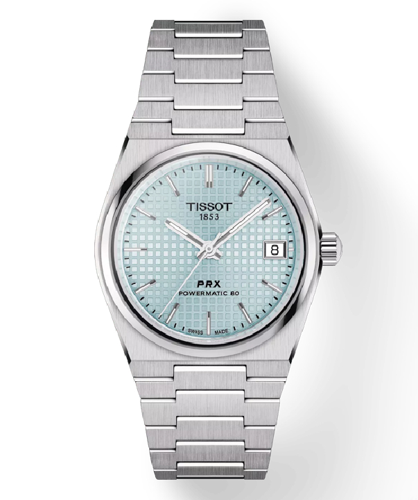 A modern reinterpretation of the 1978 PRX with an ice blue waffle-pattern dial, Nivachronâ„¢ balance spring, and satin-finish steel bracelet with folding clasp. Water-resistant up to 100 m, combining elegance with Swiss automatic performance.