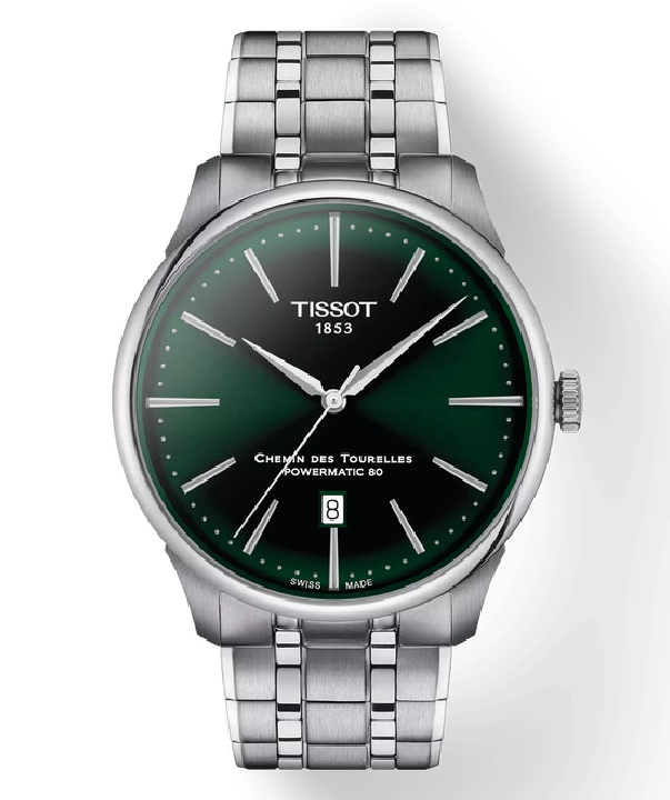 The Tissot Chemin Des Tourelles Powermatic 80 (Ref: T139.407.11.091.00) is a sophisticated Swiss automatic timepiece featuring a striking sunray green dial and an exhibition case back. Part of the Tissot T-Classic collection, it balances traditional elegance with modern mechanics, offering an impressive 80-hour power reserve and magnetic resistance.