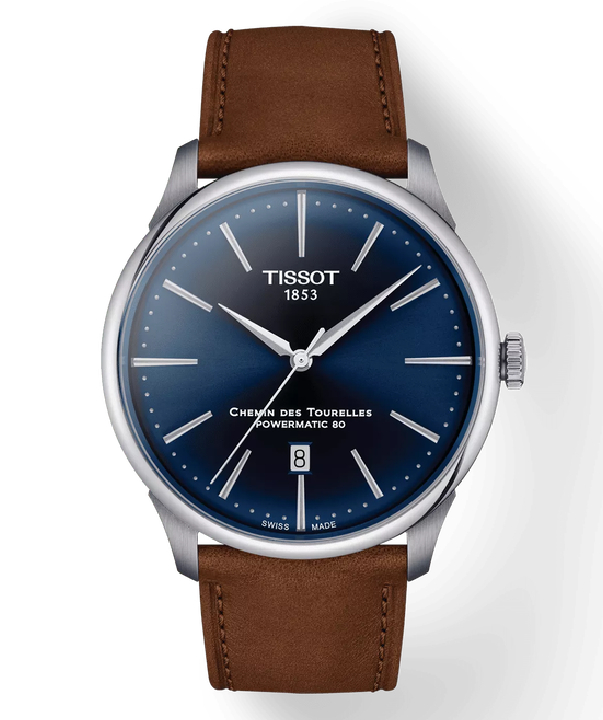 The product code T139.407.16.041.00 identifies the Tissot Chemin des Tourelles Powermatic 80, an elegant men’s automatic watch featuring a blue sunray dial and a brown leather strap. Named after the street in Le Locle, Switzerland where Tissot’s headquarters are located, this timepiece is celebrated for its classic, ageless design and reliable Swiss mechanical movement.